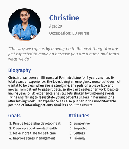 With a solid understanding of the professional benefits of a Peer Trauma Buddy program, I leveraged my user experience background to ensure that my idea was also meeting the needs of the target individuals. This allowed me to identify relevant goals that I might be able to address in my solution.